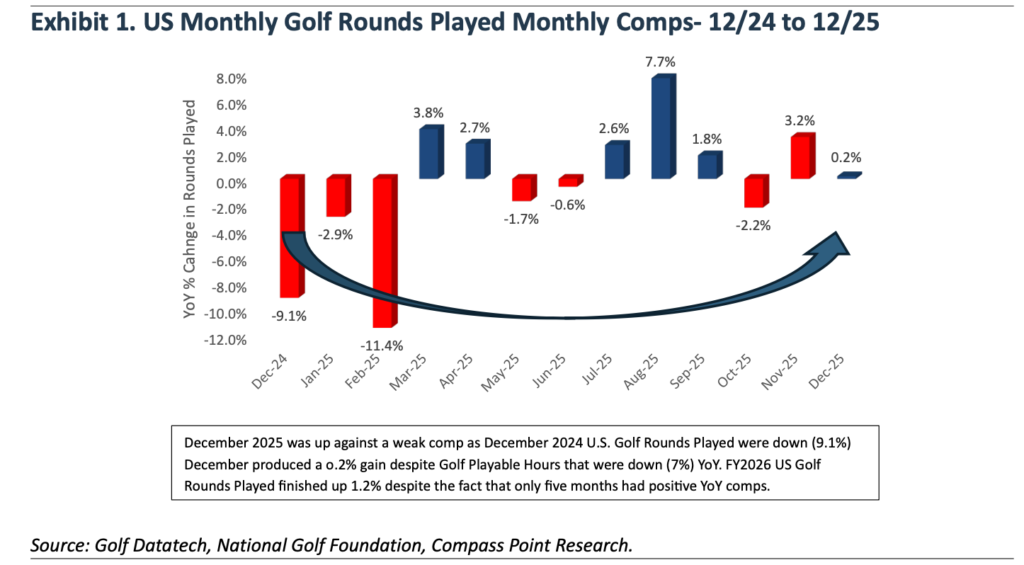As Exhibit 1 shows, the December U.S. Golf Rounds played faced a weak comparison, as the December 2024 U.S. Golf Rounds Played decreased by (9.1%). While Golf Playable Hours were down 7% in December 2025, rounds played increased by 0.2% compared to 2024, which is a phenomenal result, outperforming the weather by over 7 points. We are fully in the part of the season where total rounds slow down, so monthly changes do not have a significant impact on the YTD numbers.