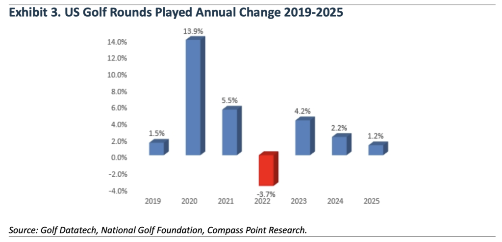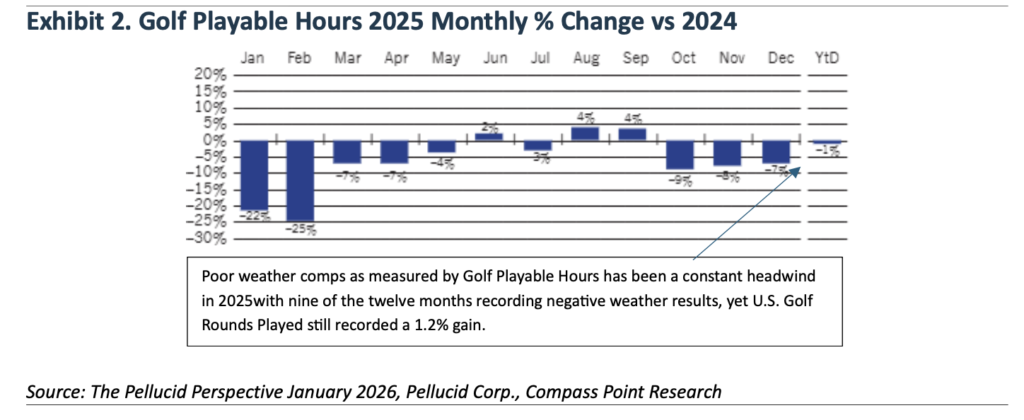 Despite poor weather conditions, the number of rounds played for 2025 was stubbornly better than the weather would suggest. Looking at Exhibit 2, we can see that only three of the twelve months in 2025 have had positive weather comps as measured by Golf Playable Hours. When we measure Golf Playable hours down (1%) YTD and U.S. Golf Rounds Played up 1.2%, we can conclude that golf demand continues to be very solid.