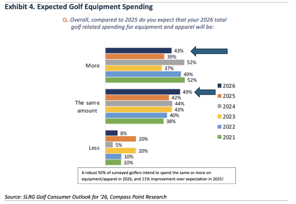 According to SLRG surveys, 65% of survey participants expect to devote more time to leisure activities in 2026 compared to 2025. That seems like a good place to start. But the most encouraging data is found in the SLRG golf spending survey, shown in Exhibit 4. The surveyed golfers reported that 92% expect to spend the same of more on equipment/apparel in 2026 as compared to 2025. That is 11% higher than what was reported in 2025.